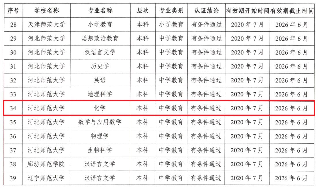 此次公布的名单中,东北师范大学、华中师范大学等4所部属师范大学的4个专业通过师范类第三级专业认证,北京师范大学等78所高校的155个专业通过师范类第二级专业认证,所有专业认证结论为“有条件通过”,结论有效期为2020年7月至2026年6月。据统计,全国仅有10所高校的化学专业通过了第二级专业认证。