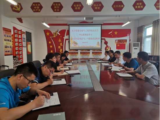 7月3日,电子信息与电气工程学院专题学习研讨习近平总书记“七一”重要讲话精神。学院党总支中心组成员及科级以上干部参加学习,会议由党总支书记李红安主持。