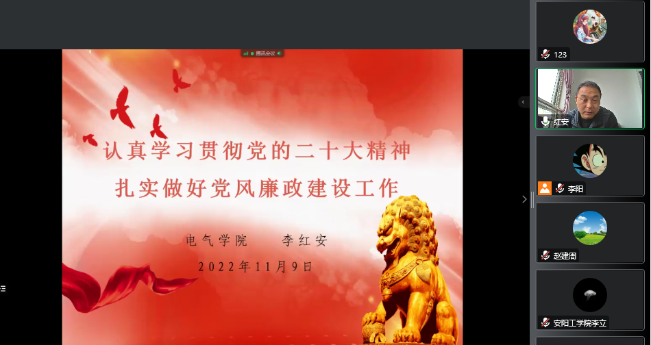 与会人员集体在线学习参观省纪委网站的网上展馆《安阳县廉政文化教育基地》。李红安以《认真学习贯彻党的二十大精神,扎实做好党风廉政建设工作》为题,从我党历来重视党风廉政建设工作、如何做好党风廉政建设工作等两方面进行解读。