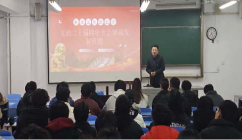 张涵以《未来五年怎么干,党的二十届四中全会擘画发展蓝图》为题,围绕“关键时期的宏伟目标”“举旗定向的鲜明指引”“系统全面的发展蓝图”和“当代学子当如何作为”四个方面为大家详细讲解了本次全会的重要意义。