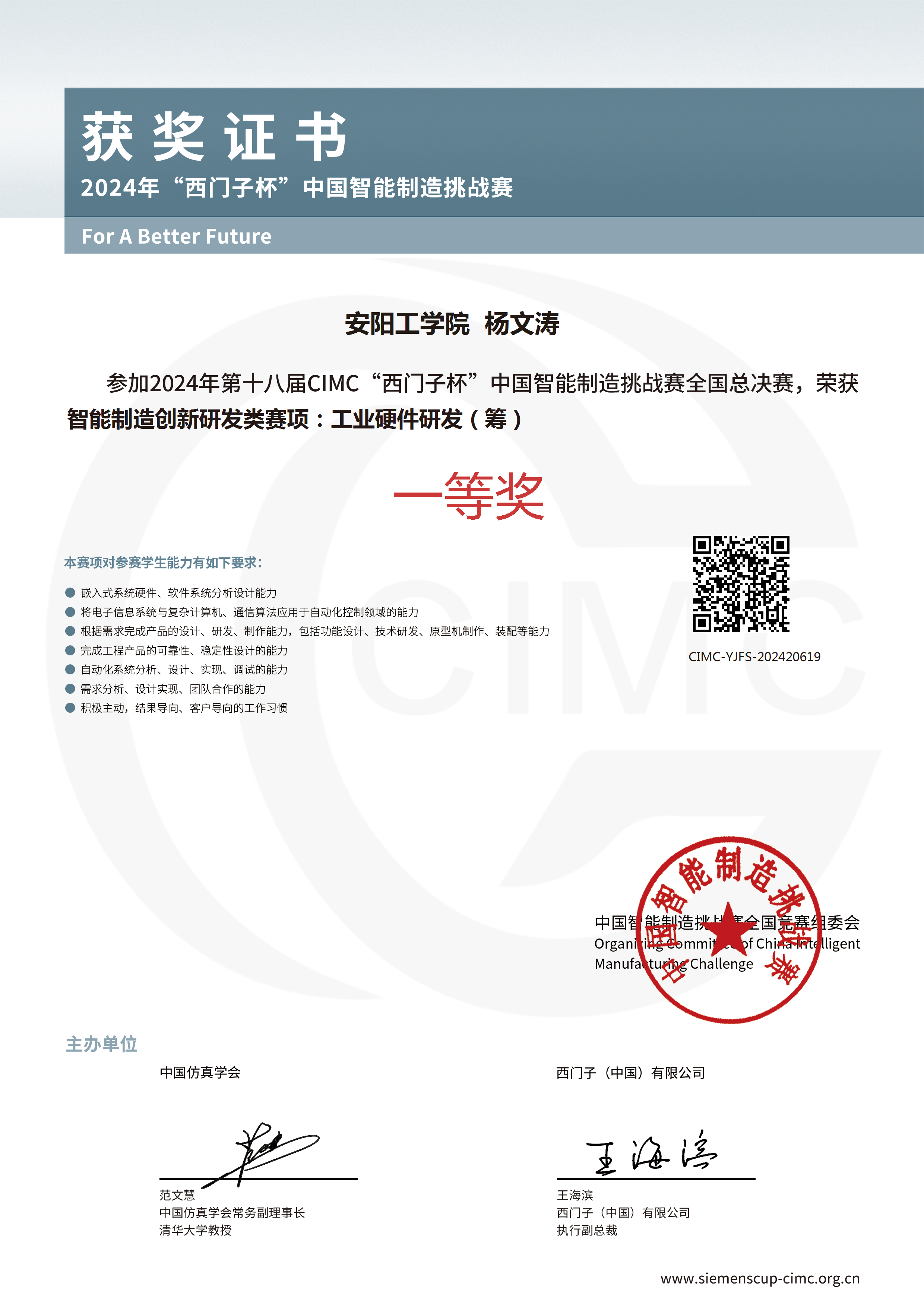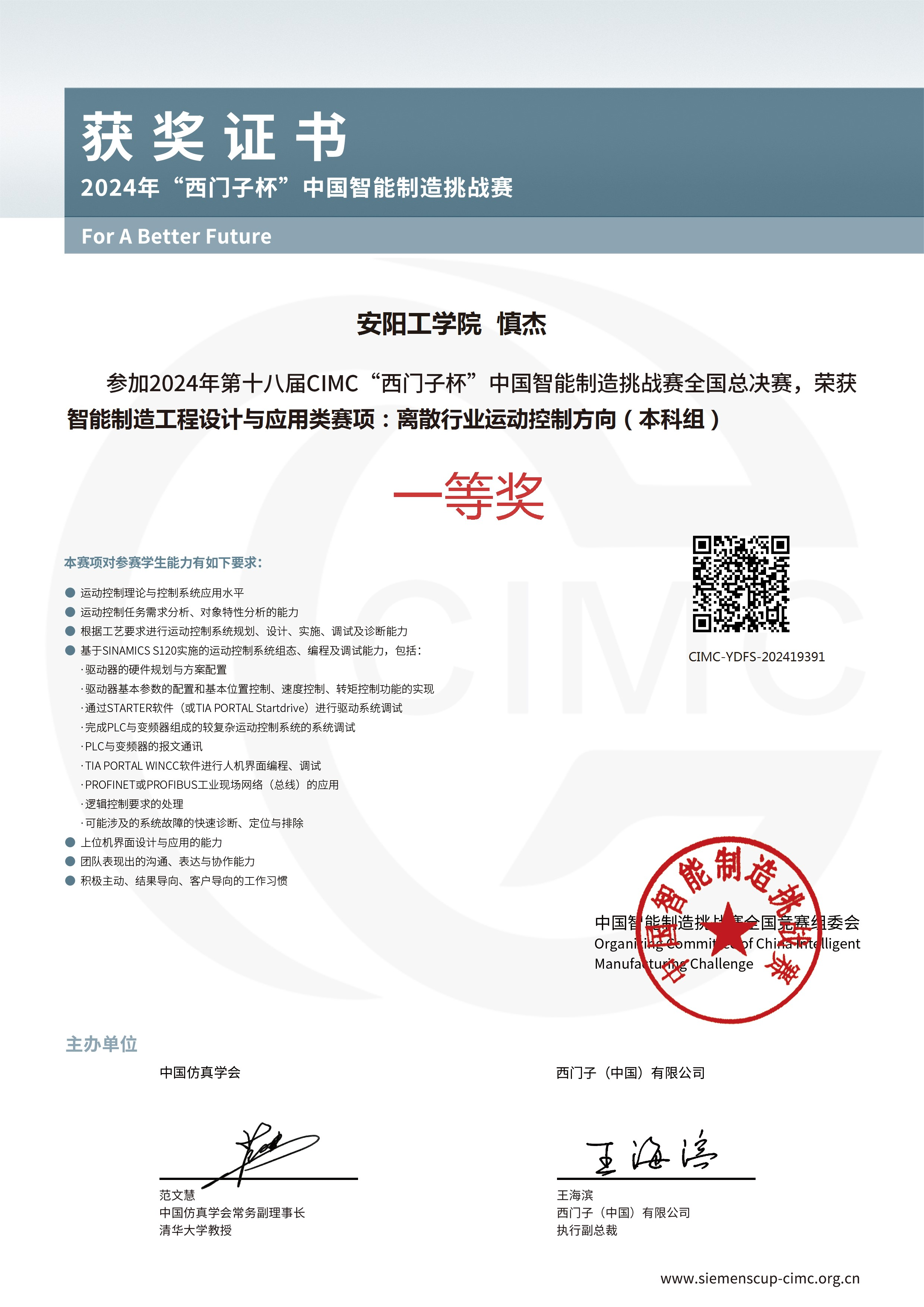 “西门子杯”中国智能制造挑战赛受教育部国际合作与交流司指导,由中国仿真学会和西门子(中国)有限公司联合主办,是中国智能制造领域规模最大的A类学科竞赛。学院坚持“以赛促教、以赛促学、以赛促创、以赛育人”的培养理念,将学科竞赛融入自动化、电气工程及其自动化等专业人才培养全过程,持续推动智能制造领域人才培养更上新台阶