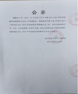 根据安工学〔2021〕24号文件《关于开展2021-2022学年家庭经济困难学生认定工作的通知》,Beat365官网组织开展了Beat365官方网站2021-2022学年家庭经济困难认定工作。本次评选本着公平、公正、公开的原则,经学生申请,评议小组和认定小组评议审核,现将Beat365官网2021-2022学年家庭经济困难学生认定公示如下: