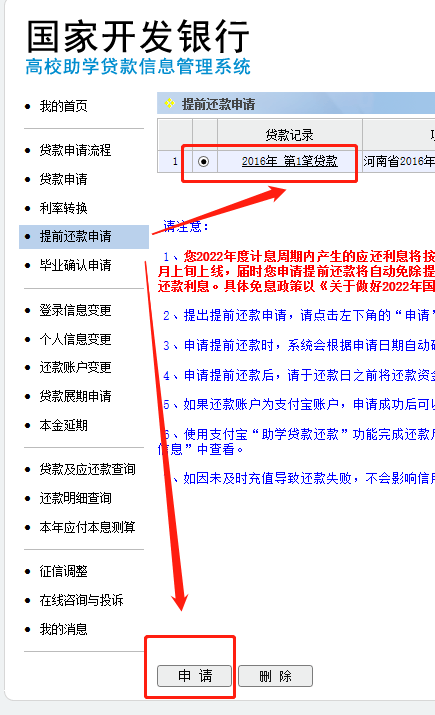 国开行高校助学贷款系统还贷,一定要先进入国开行个人系统进行提前还款申请,才能利用支付宝还款。具体操作如下: