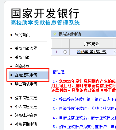 1.学生登录国家开发银行助学贷款信息网进行“提前还款”申请(11月除外)。每个月可以申请一次,1-15日申请的,计息到本月20日,本月20日为还款日;16-30日申请的,计息到下月20日,下月20日为还款日。