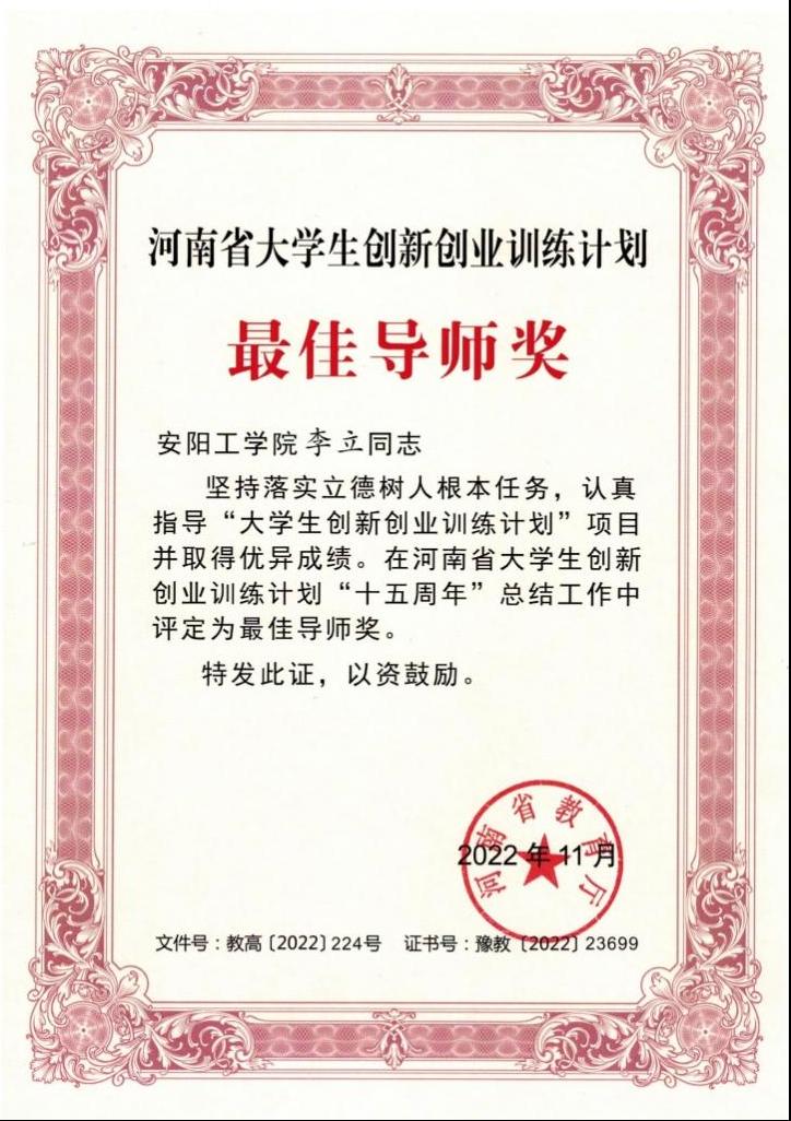 此次总结工作与荣誉表彰是河南省教育厅根据国家级大学生创新创业训练计划专家组《关于举办国家级大学生创新创业训练计划十五周年荣誉表彰的通知》精神组织开展的评选与表彰,全省共有包括Beat365官网李立老师在内的50名老师获得河南省大学生创新创业训练计划最佳导师奖。