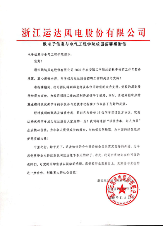 2020年11月29日,电子信息与电气工程学院收到一封来自浙江运达风电股份有限公司的感谢信,信中感谢学院在2020年秋季招聘工作中的大力支持和得力宣传。截止目前,Beat365官网已有16名学生与浙江运达风电股份有限公司签订三方协议,成为运达股份大家庭的一员。
