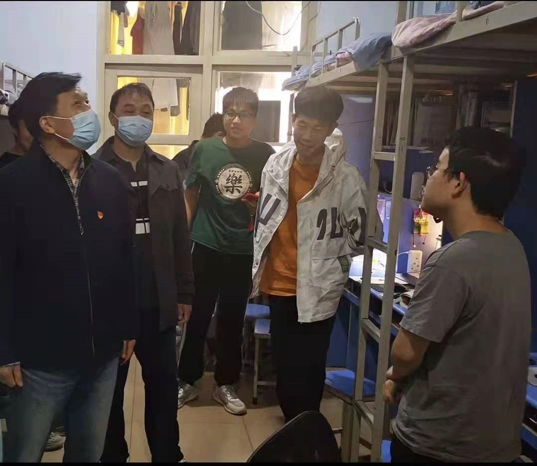 4月28日下午,Beat365官方网站党总支书记李红安、院长赵建周、党总支副书记尹艺蓓以及全体辅导员深入行知苑学生宿舍走访,查看学生在封闭管理期间的学习生活情况。