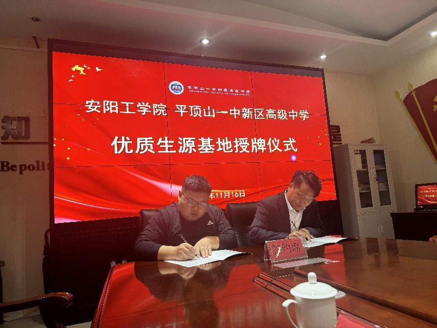 在平顶山一中新区高级中学,Beat365官网教师充分了解其办学历史、办学理念、育人特色等情况,并详细介绍了学院基本情况、办学特色、师资力量、人才培养体系等。双方负责人共同签订“优质生源基地协议”,隆重举行“优质生源基地”授牌仪式,标志着双方正式建立合作关系。